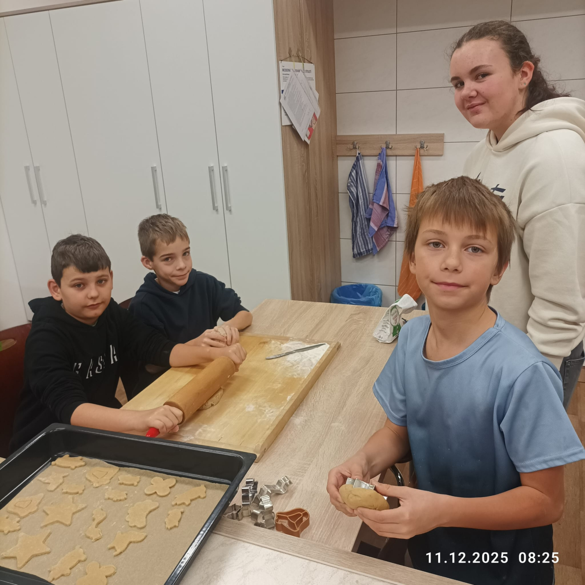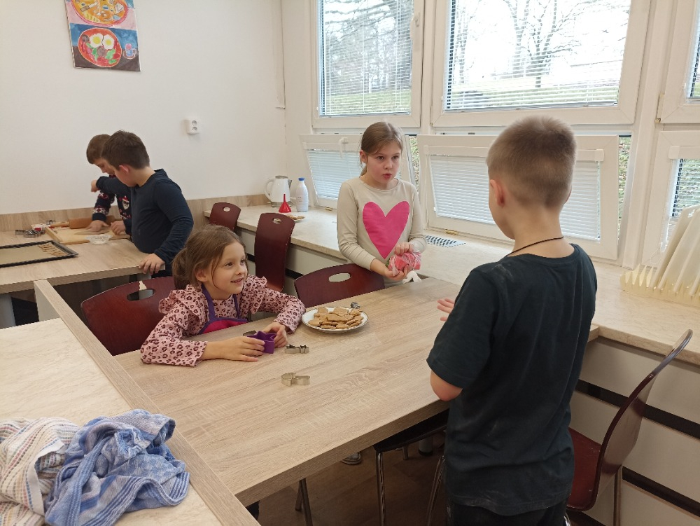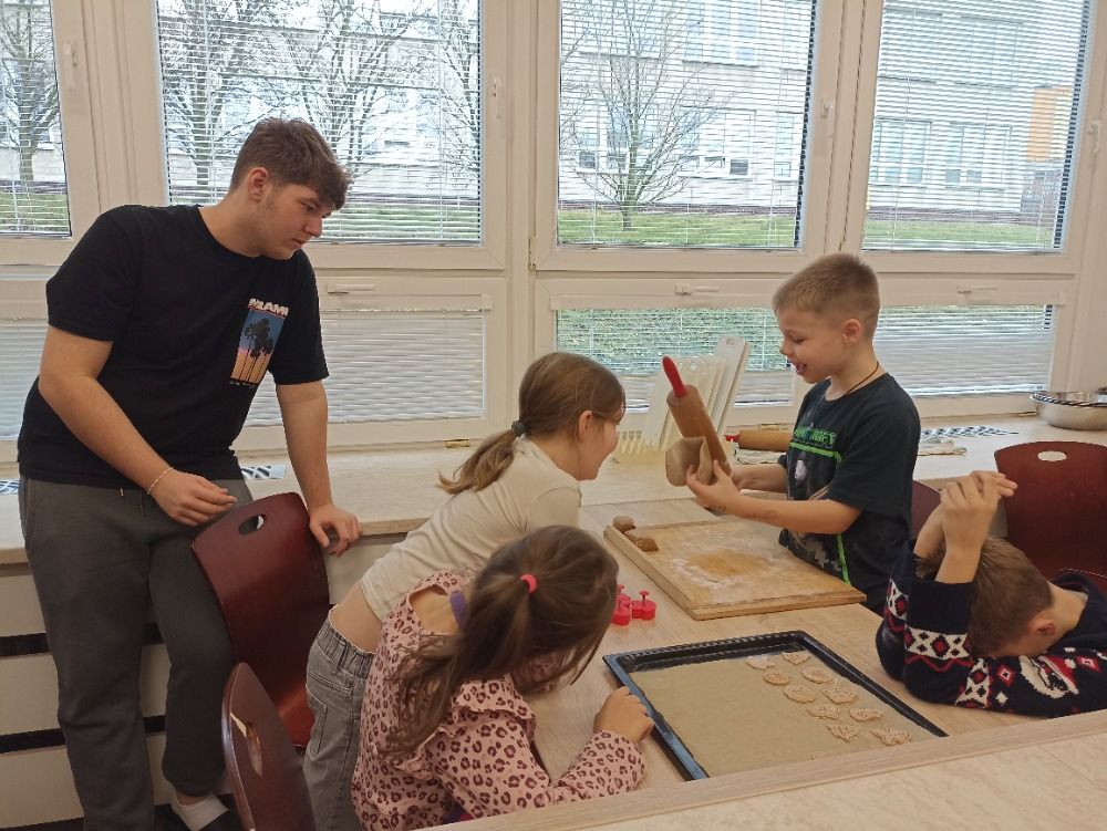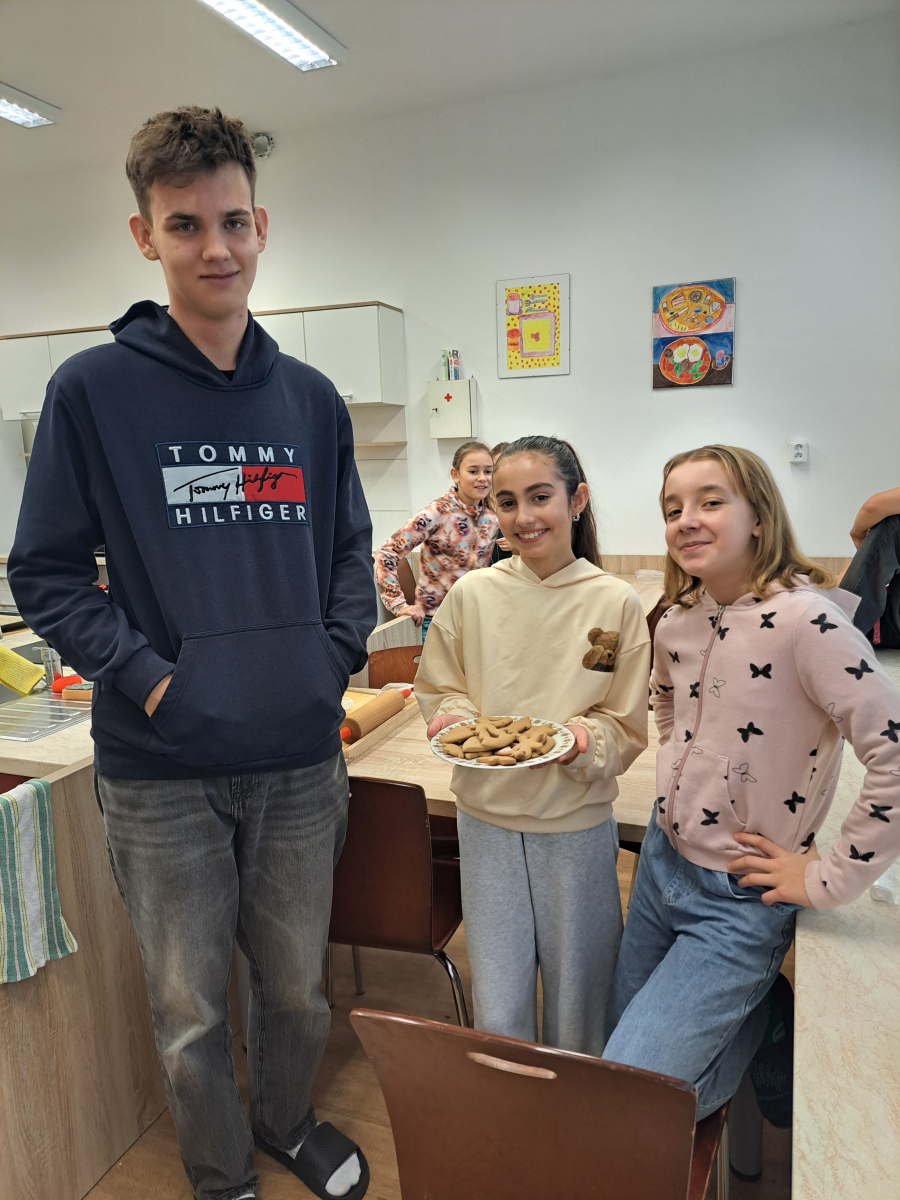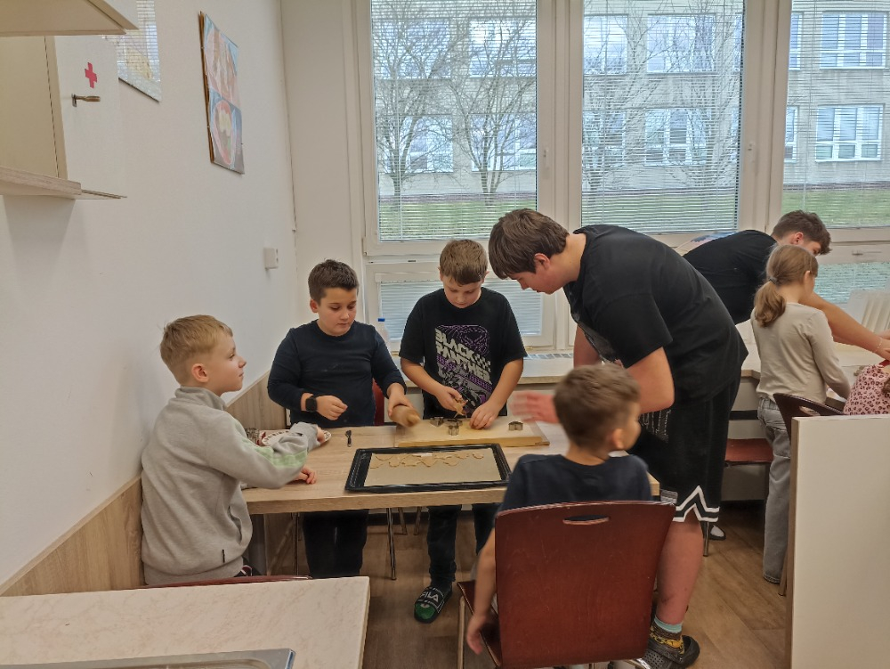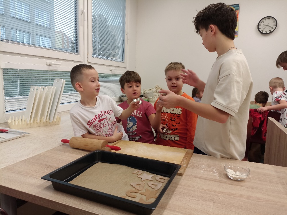 Během jednotlivých dnů se třídy postupně zapojily do přípravy vánočního cukroví. Děti si pod vedením žáků 8. a 9. ročníků vyzkoušely válení těsta a vykrajování tvarů. Na vše dohlédly paní asistentky. Pečení nebylo jen o sladkých pochoutkách, ale také o spolupráci, trpělivosti, vzájemné pomoci a práci v týmu. Pro mnohé z nich to byla také příležitost získat nové zkušenosti a dovednosti, které mohou využít i doma. Hotové cukroví si děti s hrdostí odnášely domů nebo jím potěšily své spolužáky a učitele. Celá akce se vydařila a přispěla k vytvoření přátelské a sváteční atmosféry, která neodmyslitelně patří k adventnímu času.