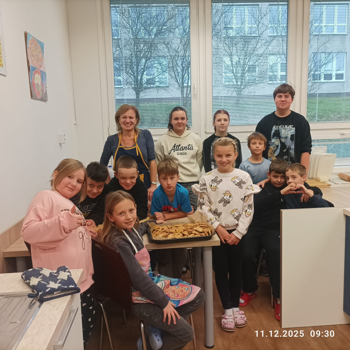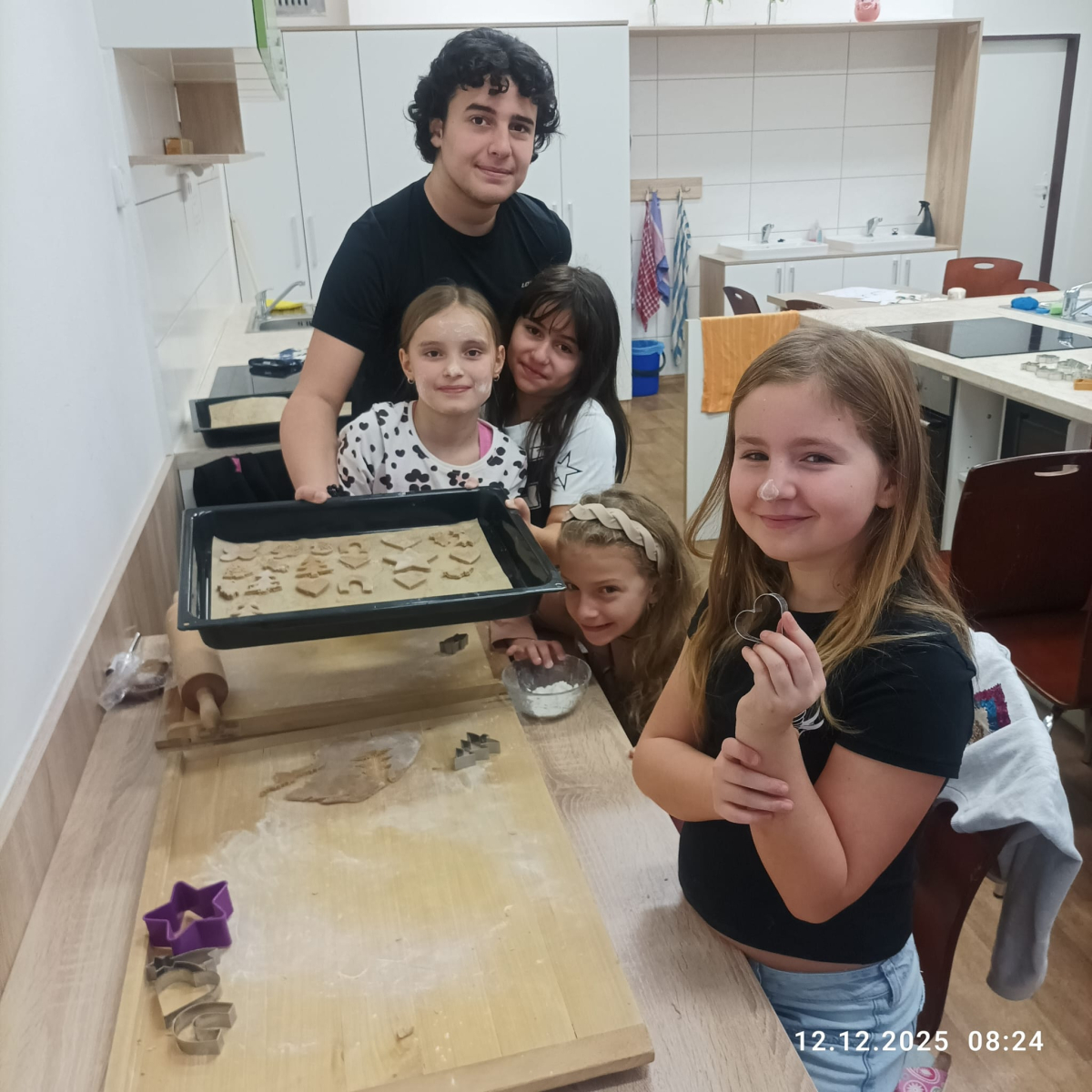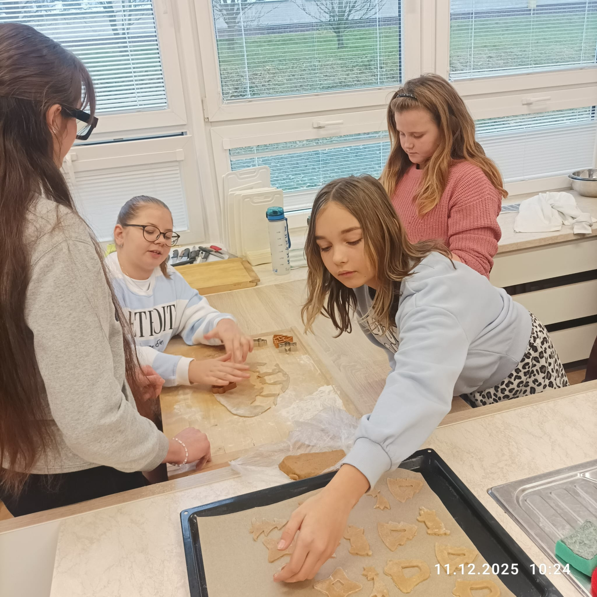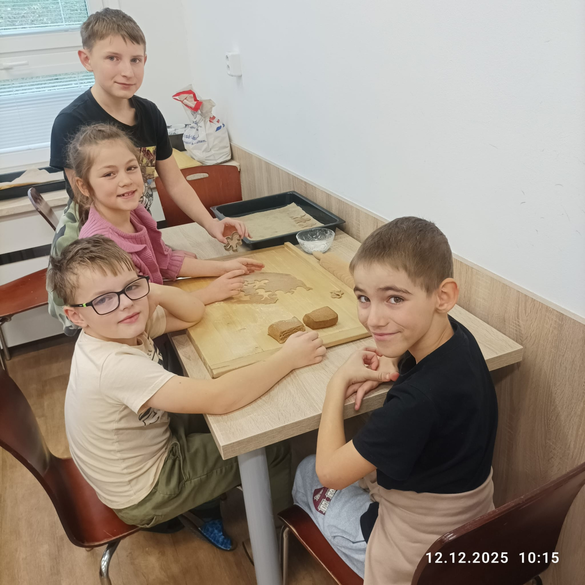 Během jednotlivých dnů se třídy postupně zapojily do přípravy vánočního cukroví. Děti si pod vedením žáků 8. a 9. ročníků vyzkoušely válení těsta a vykrajování tvarů. Na vše dohlédly paní asistentky. Pečení nebylo jen o sladkých pochoutkách, ale také o spolupráci, trpělivosti, vzájemné pomoci a práci v týmu. Pro mnohé z nich to byla také příležitost získat nové zkušenosti a dovednosti, které mohou využít i doma. Hotové cukroví si děti s hrdostí odnášely domů nebo jím potěšily své spolužáky a učitele. Celá akce se vydařila a přispěla k vytvoření přátelské a sváteční atmosféry, která neodmyslitelně patří k adventnímu času.