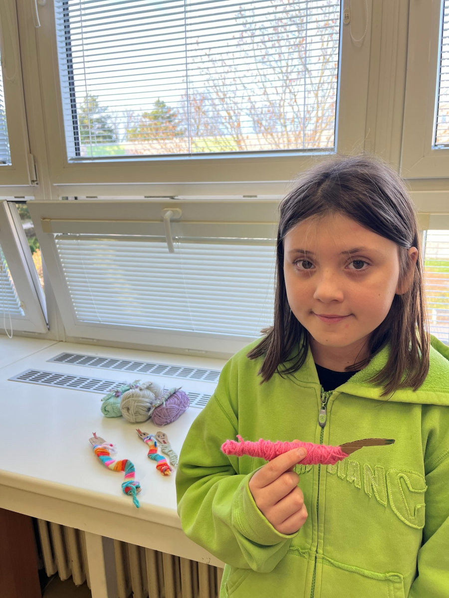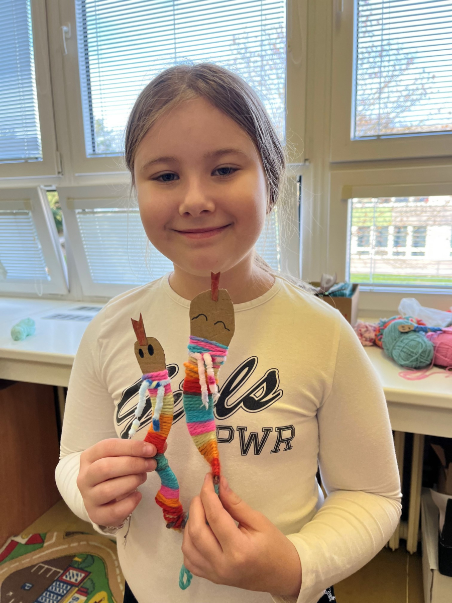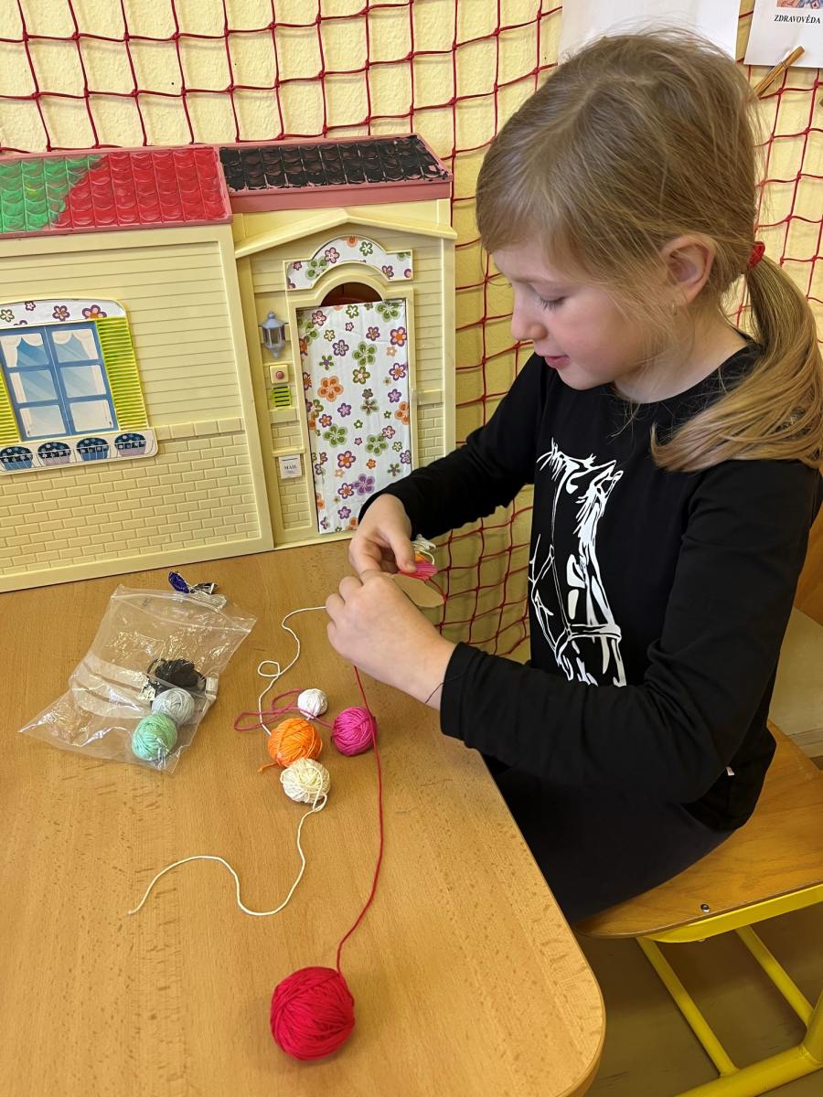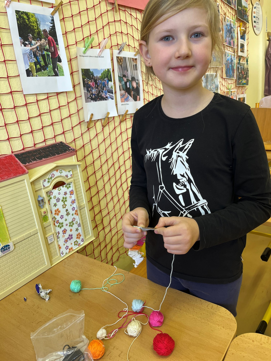 Starší žáci školní družiny často vyrábějí z bavlnek a dalších materiálů. Nejprve vyráběli strašidýlka z bavlnek a klacíků a později se pustili do výroby „ hmyzích kamarádů". K tomu potřebovali nejen bavlnky, ale i karton, ze kterého vystřihovali například červíky,ještěrky a háďátka. Při tvoření měli velkou trpělivost. Někteří si vyrobili jednobarevné kamarády, jiní zapojili fantazii a měli je různobarevné.