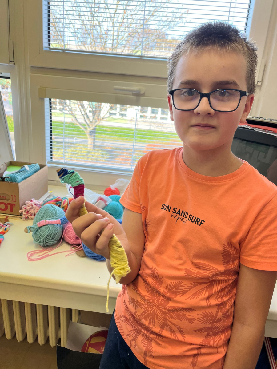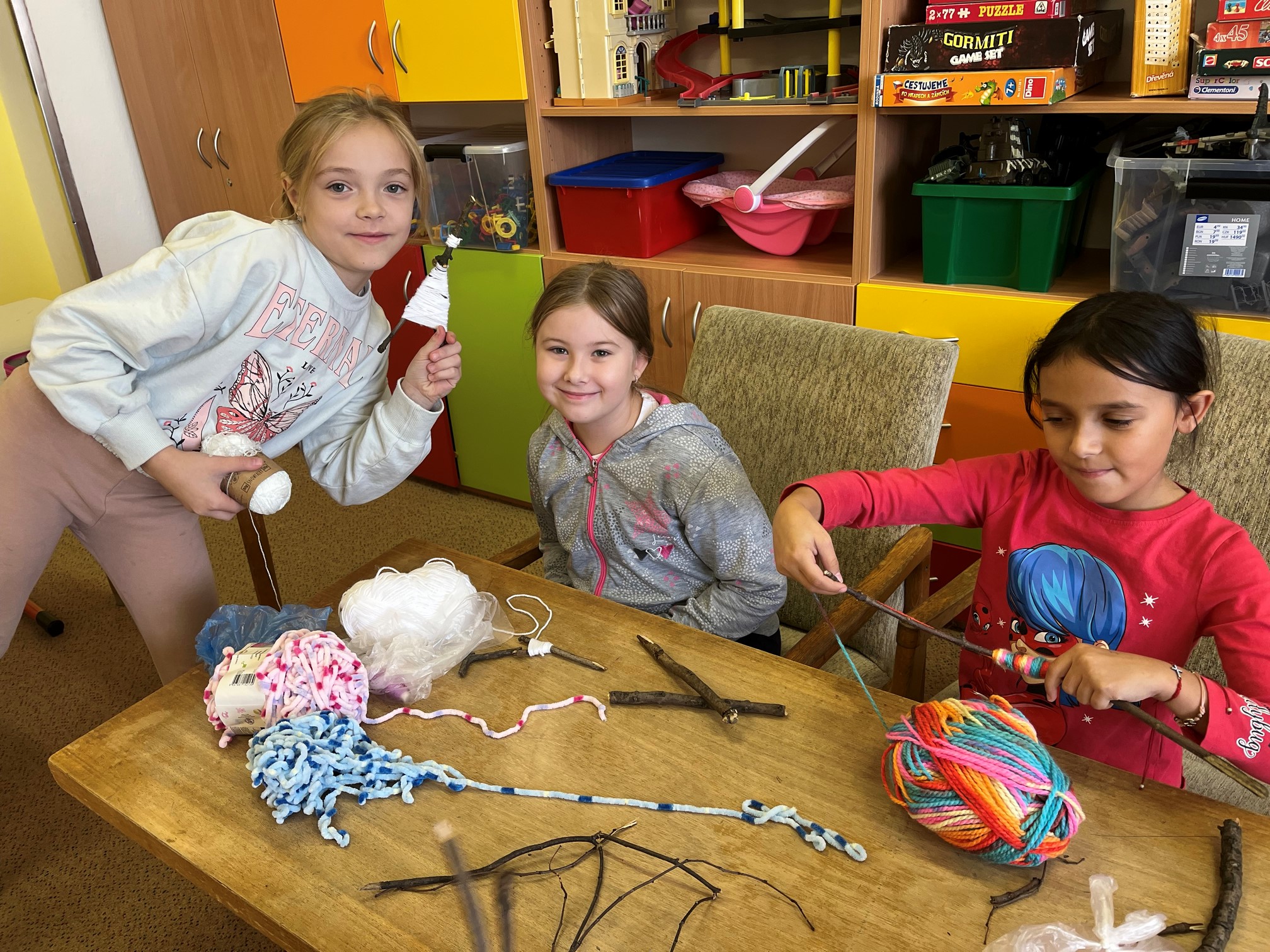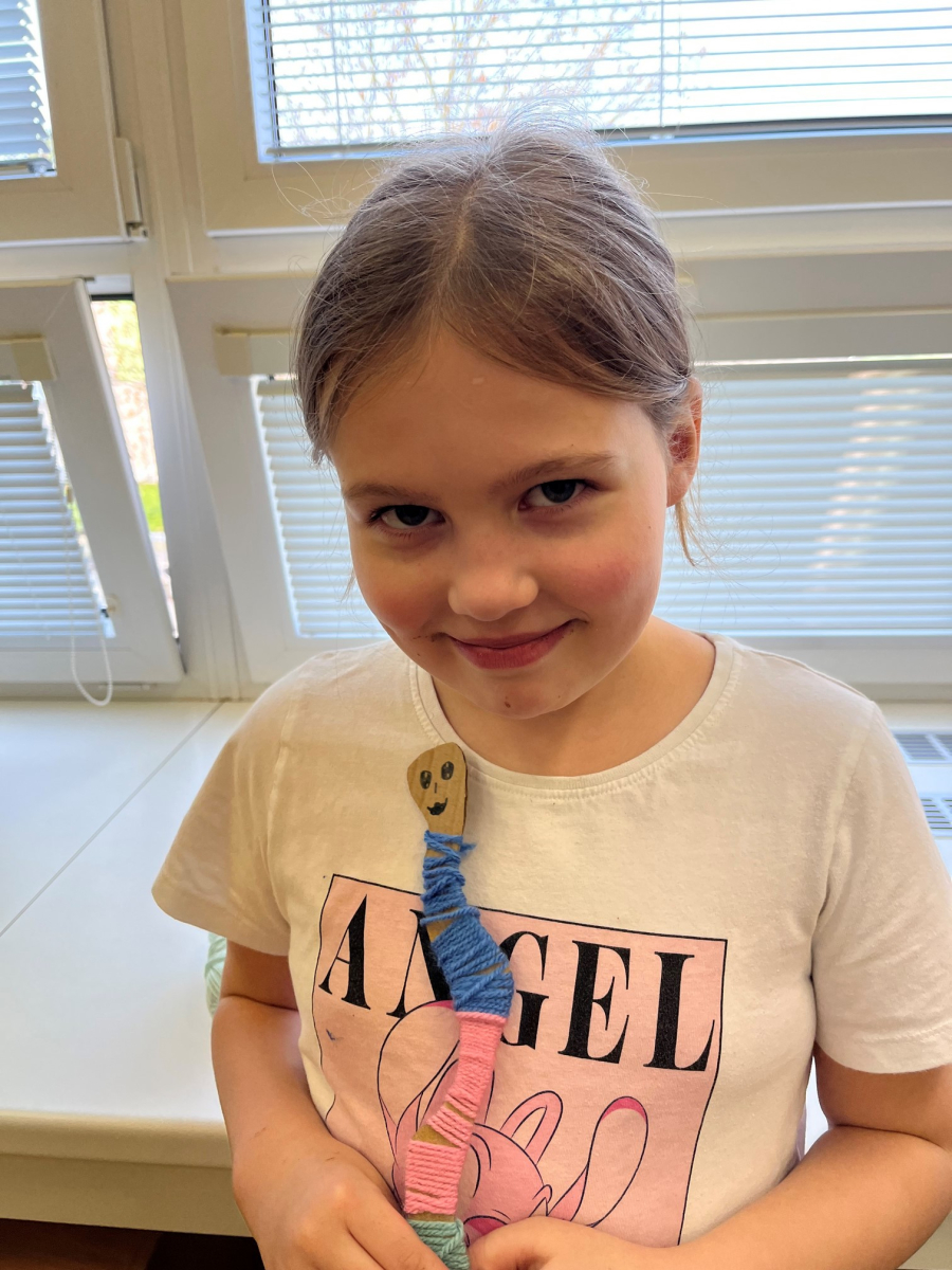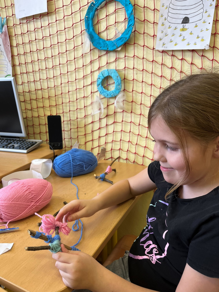 Starší žáci školní družiny často vyrábějí z bavlnek a dalších materiálů. Nejprve vyráběli strašidýlka z bavlnek a klacíků a později se pustili do výroby „ hmyzích kamarádů". K tomu potřebovali nejen bavlnky, ale i karton, ze kterého vystřihovali například červíky,ještěrky a háďátka. Při tvoření měli velkou trpělivost. Někteří si vyrobili jednobarevné kamarády, jiní zapojili fantazii a měli je různobarevné.